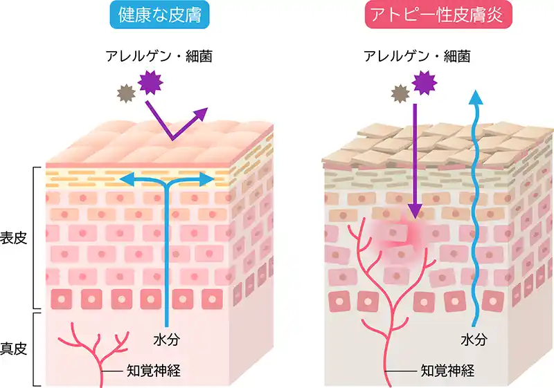 アトピー性皮膚炎では、この角質層のバリア機能が低下していることが多く、以下の様なことが起こります。